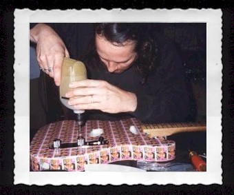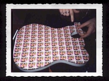 I used a white sealer on an Alder tele body. Then my wife, Karan and I pasted, with a wet sponge and our tongues, 7 sheets of Elvis stamps. I had the body clear-coated. |
